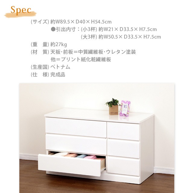 鏡面塗装が美しいローチェスト収納です。 組立不要の完成品です。 ◆お部屋を明るく演出するホワイト色です。 ◆引出は大小計6杯ありますので、種類別に衣服を収納できます。 ◆引出は重いものを入れても開閉が楽なレール仕様です。 【商品サイズ】約 横89.5×奥行40×高さ54.5cm 【引出内寸】 (小3杯)約 横21×奥行33.5×高さ7.5cm (大3杯)約 横50.5×奥行33.5×高さ7.5cm 【重 量】約 27kg 【材 質】前板・天板=中質繊維板・ウレタン塗装 他=プリント紙化粧繊維板 【仕 様】完成品 【生産国】ベトナム 北海道 沖縄及び離島は別途送料がかかる場合があるので購入の際は一度お問い合わせくださいませ