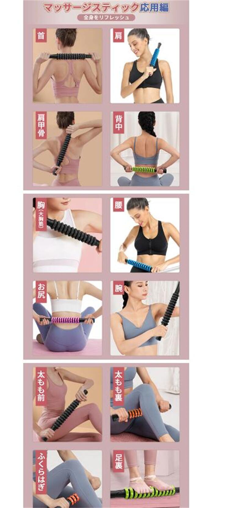 全身のコリをほぐす手元のサポーター, ふくらはぎ・肩・腰まで気になる部位をローラーで優しく刺激。運動後の筋肉ケアや日常の疲れに、手軽なセルフマッサージを実現! 持ち運び便利で、いつでも気持ちいいリラックスを