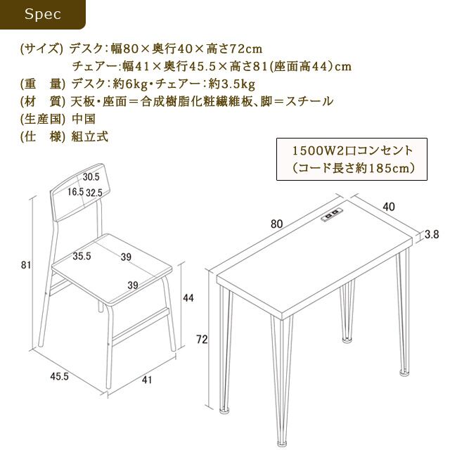 【商品サイズ】デスク:約 幅80×奥行40×高さ72cm・チェア:幅41×奥行45.5×高さ81(座面高44)cm