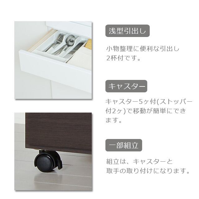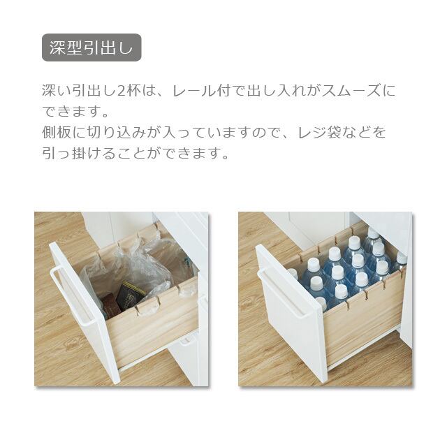 ◆深い引出し2杯は、レール付で出し入れがスムーズにできます。側板に切り込みを入れ、レジ袋などを引っ掛けて使える仕様にしています。