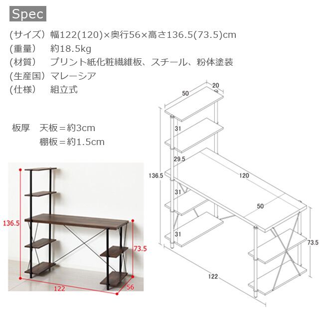 【商品サイズ】約 幅122(120)×奥行56×高さ136.5(73.5)cm