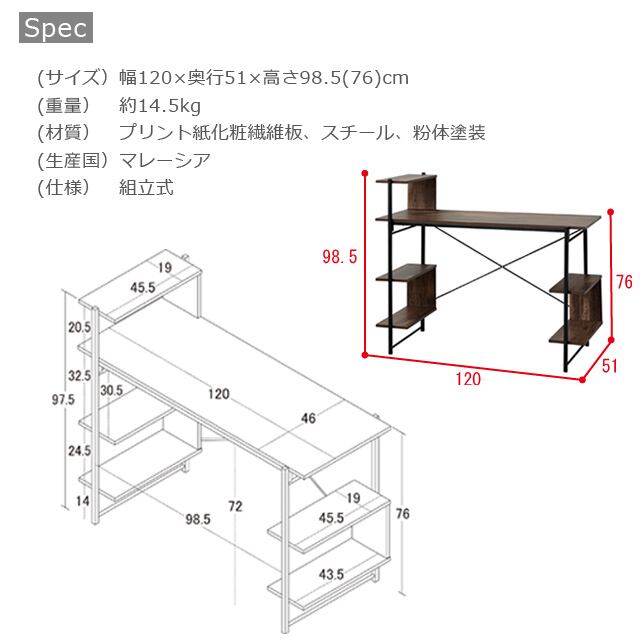 【商品サイズ】約 幅120×奥行51×高さ98.5(76)cm