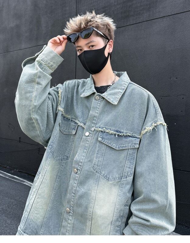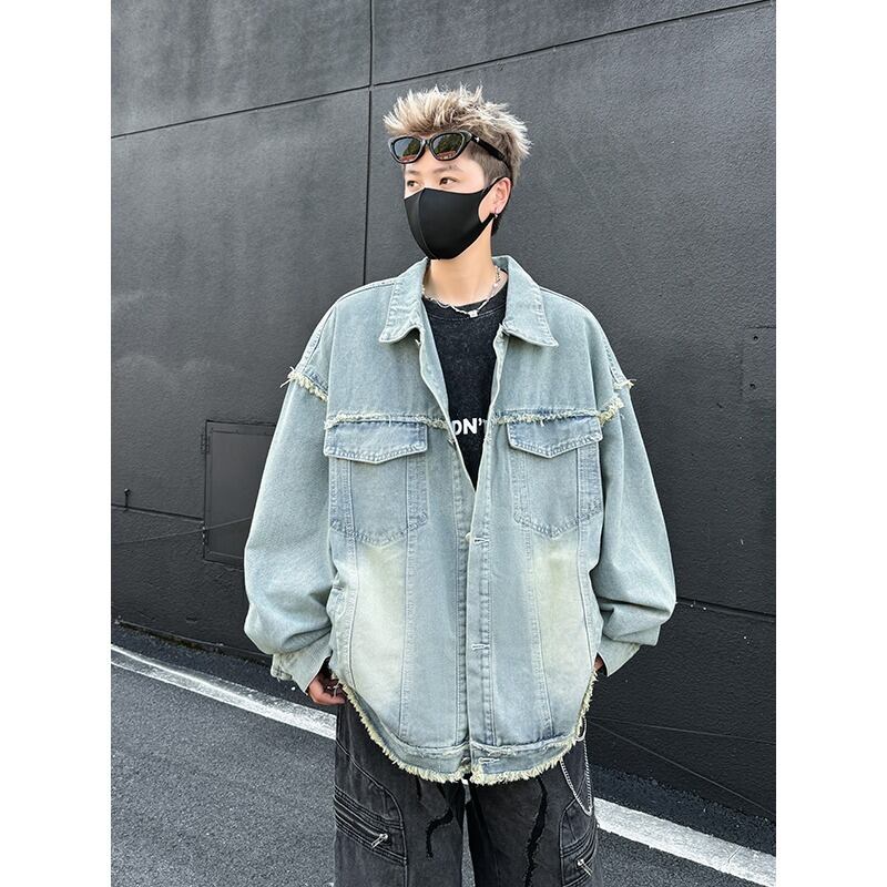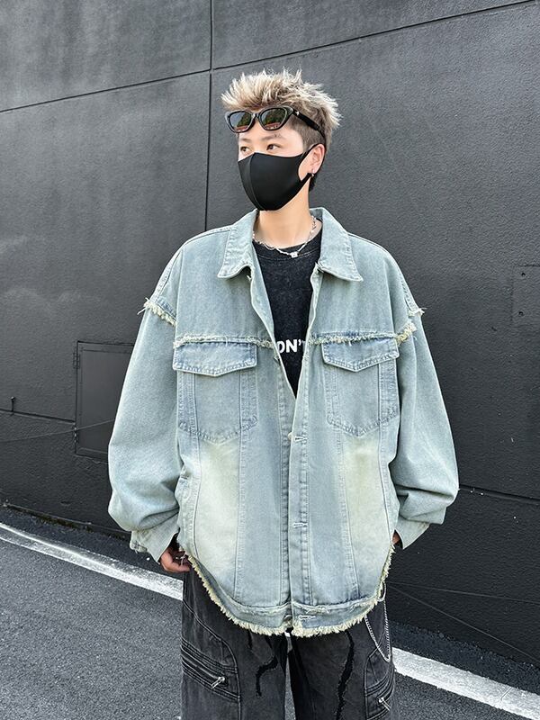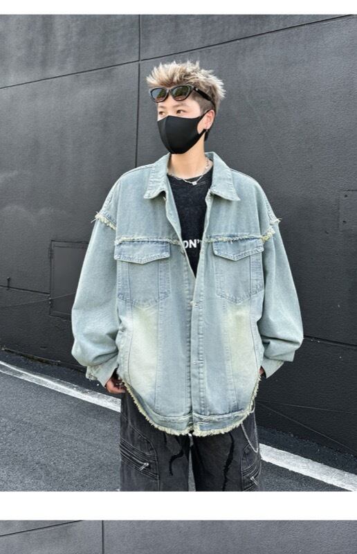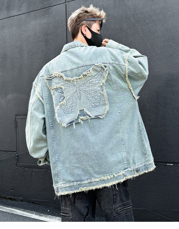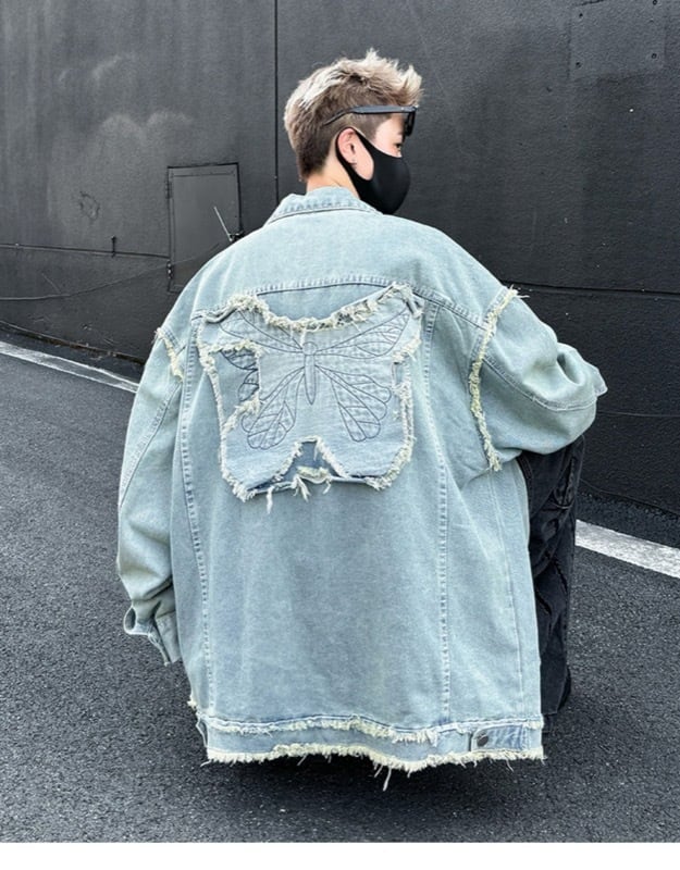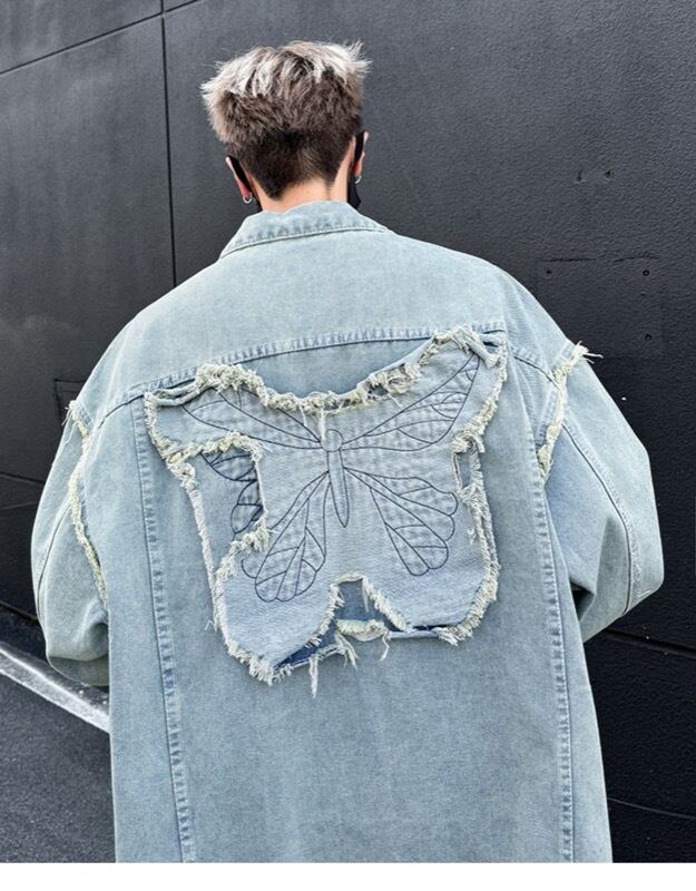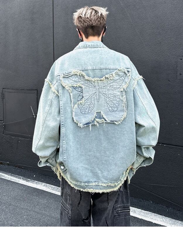 ユニセックス デニムジャケット 蝶刺繍デザイン 水洗加工 美式ストリート カジュアル アウター