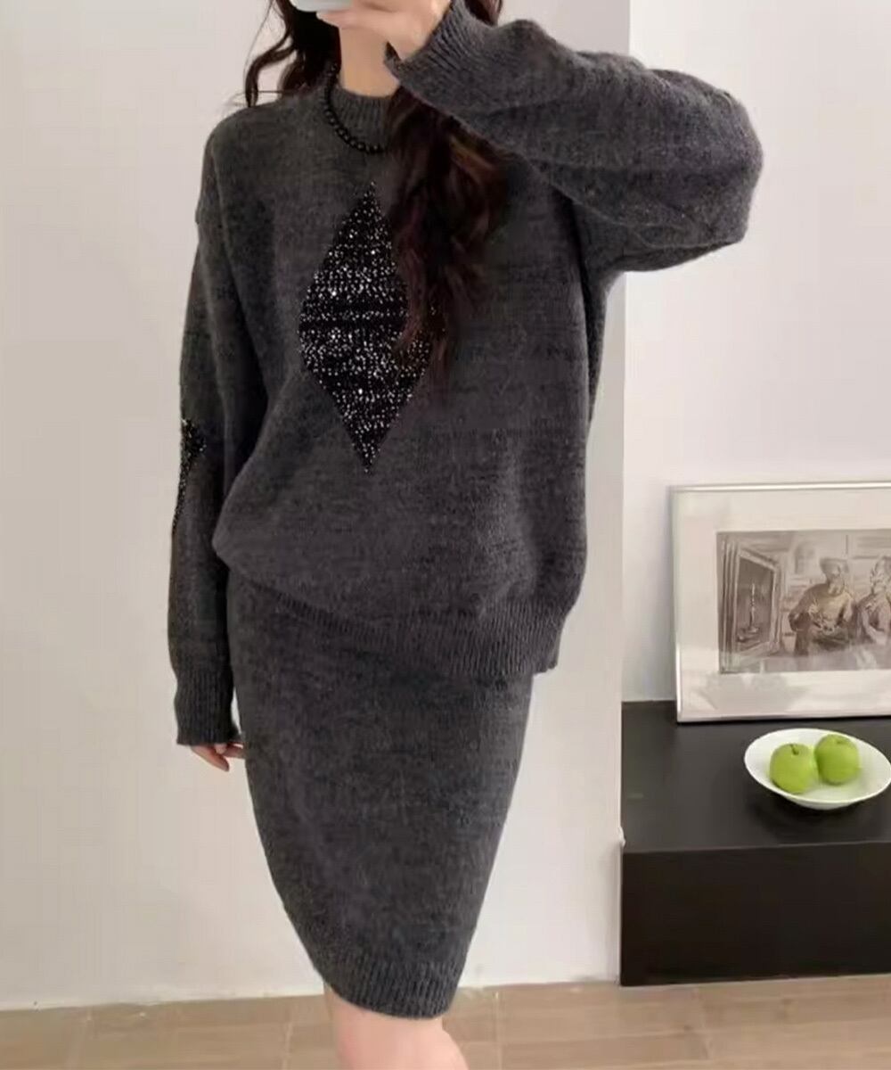 韓国風きらきらニット上下セット レディース 菱形モチーフニットトップス長袖 ニットミニスカート おしゃれ 秋冬ツーピース
