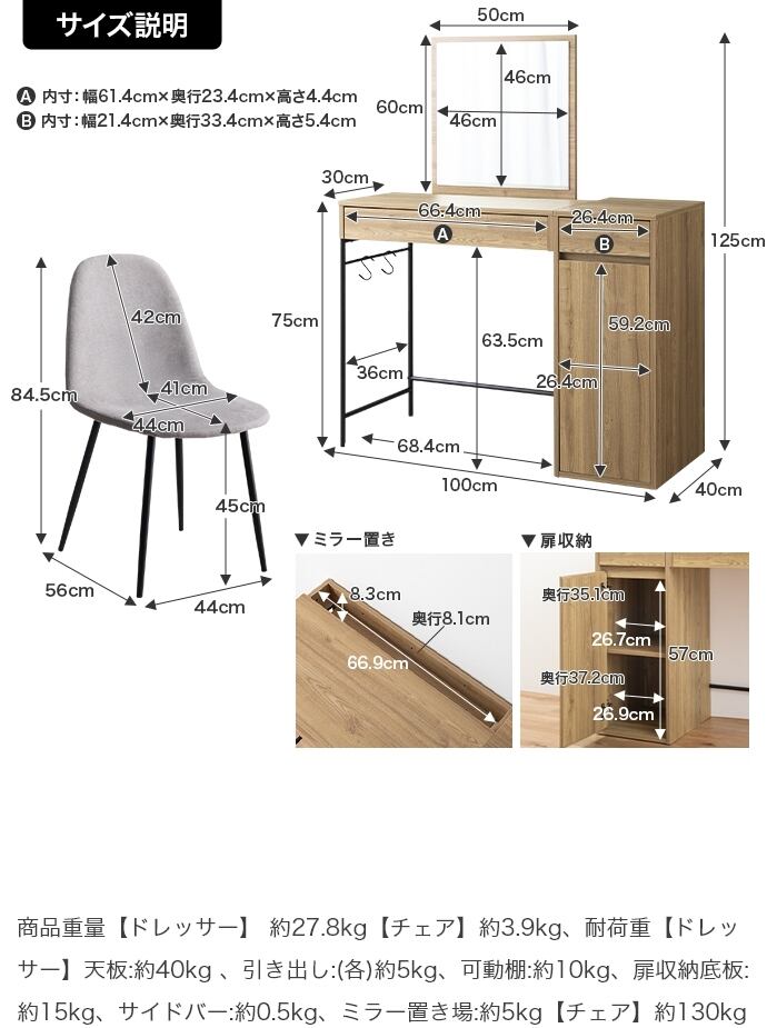【耐荷重】天板:約40kg 、引き出し:(各)約5kg、可動棚:約10kg、扉収納底板:約15kg、サイドバー:約0.5kg、ミラー置き場:約5kg、チェア:約130kg