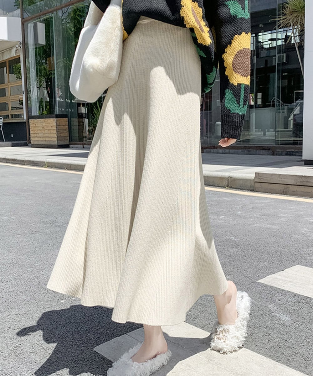レディース Aラインスカート リブスカート ウエストゴム ハイウエスト ボトムス 体型カバー 大人可愛い 韓国風