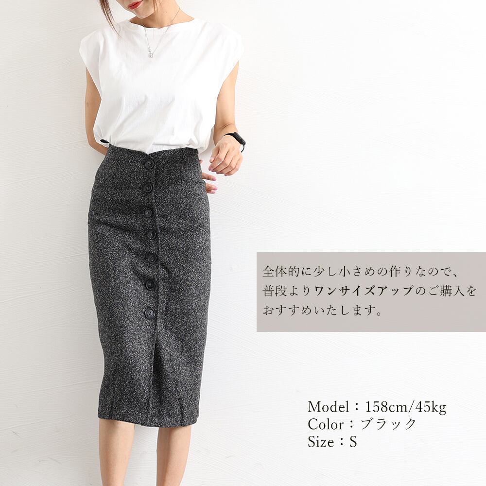 フロントボタン全開式のハイウエストミモレ丈ツイードスカート