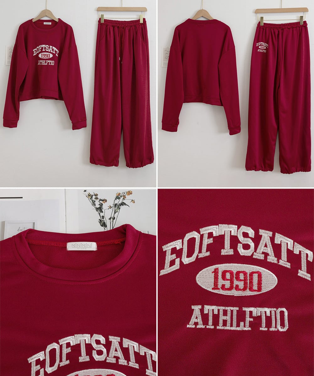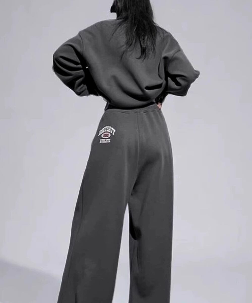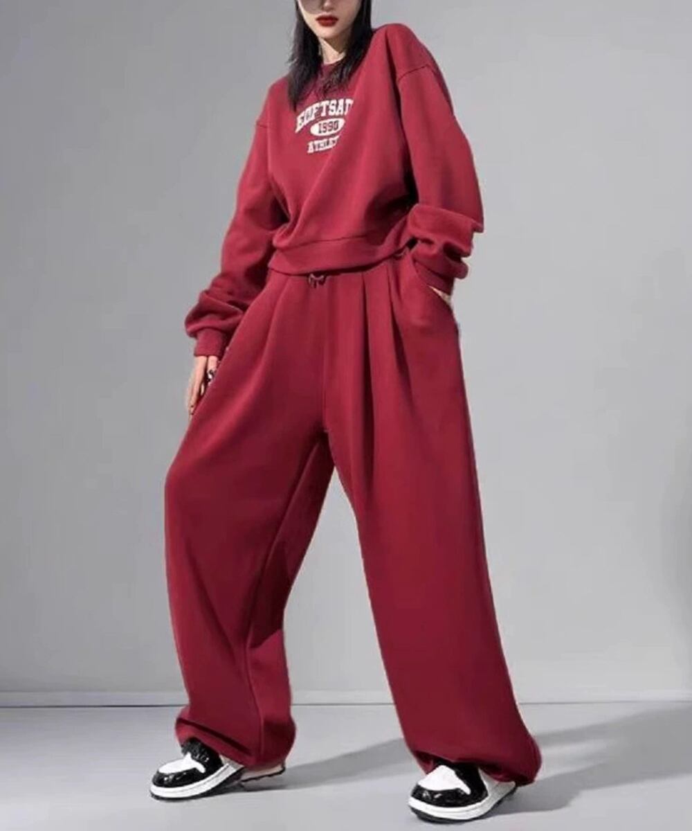 カレッジロゴが目を惹くスウェットトップスとワイドパンツのレディースセットアップ。