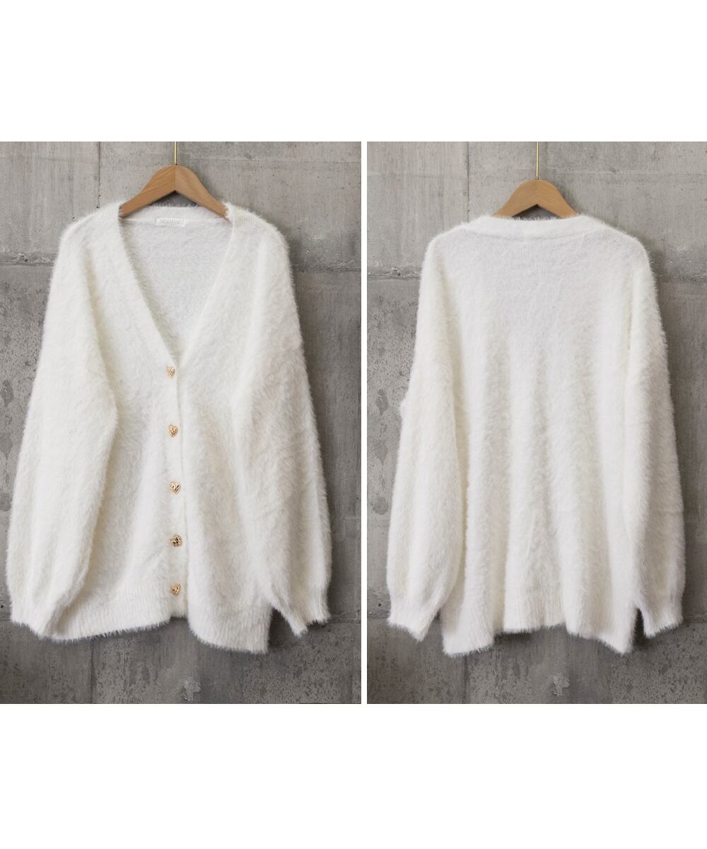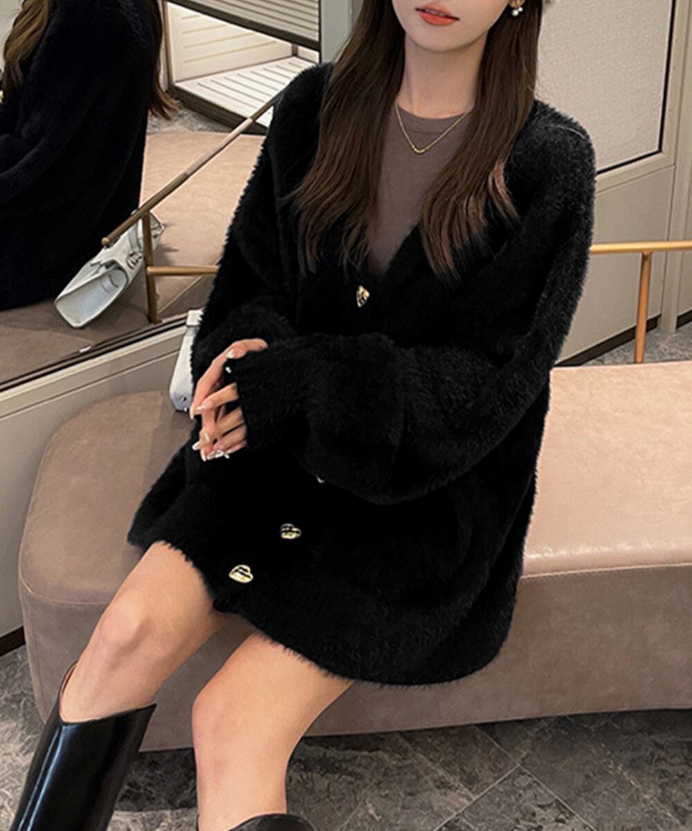 レディース ハートボタン秋冬ニット ミンクタッチカーディガン Vネックモヘヤセーター ゆったりニットトップス 大人可愛い