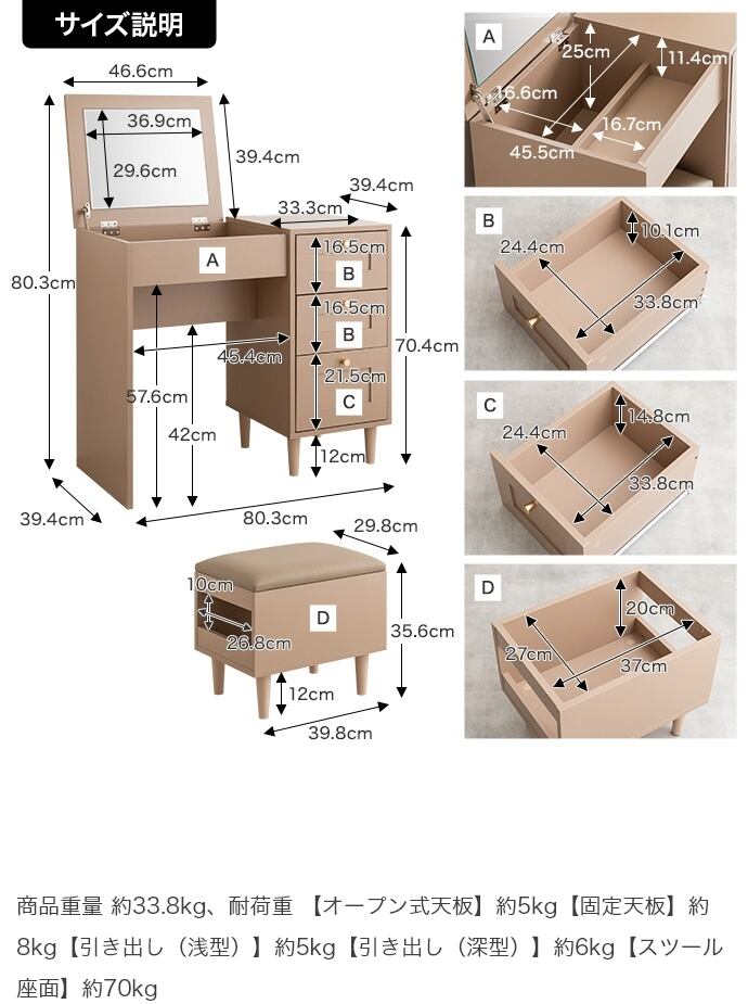 【耐荷重】オープン式天板:約5kg、固定天板:約8kg、引き出し収納(浅型):約5kg、引き出し収納(深型):約6kg、スツール座面:約70kg